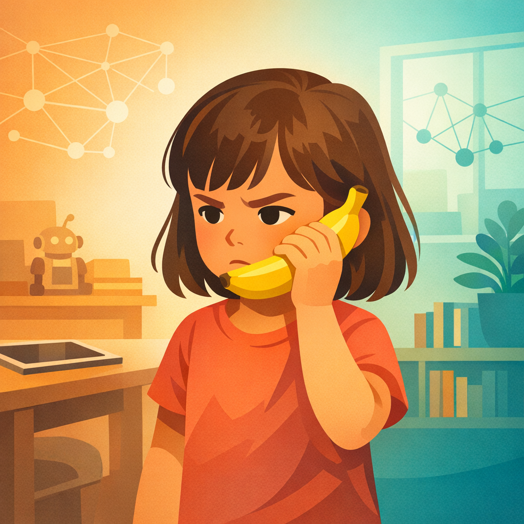 A three-year-old holds a banana to her ear and says "hello" — and in doing so demonstrates something generative AI cannot. The gap between counterfactual imagination and statistical generation matters enormously, especially when we're deploying these tools in classrooms.